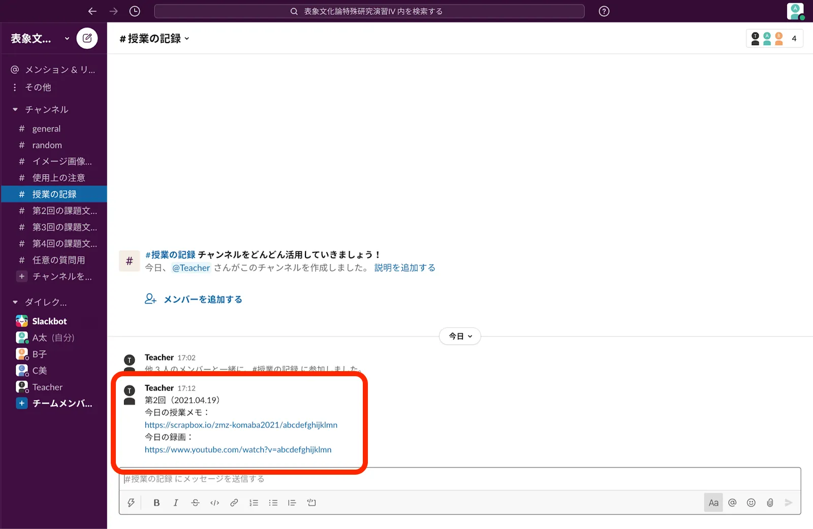 - 課題文献ごとにひとつのチャンネルを用意します.授業の1週間前に課題文献をスレッドの形で提示します.