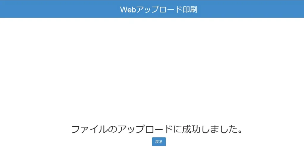 正しくアップロードできた場合は,以下の画面が表示されます.画面の「戻る」をクリックすると,再びWebアップロード画面に戻ります.Webアップロードをやめる場合はWebブラウザを閉じてください.