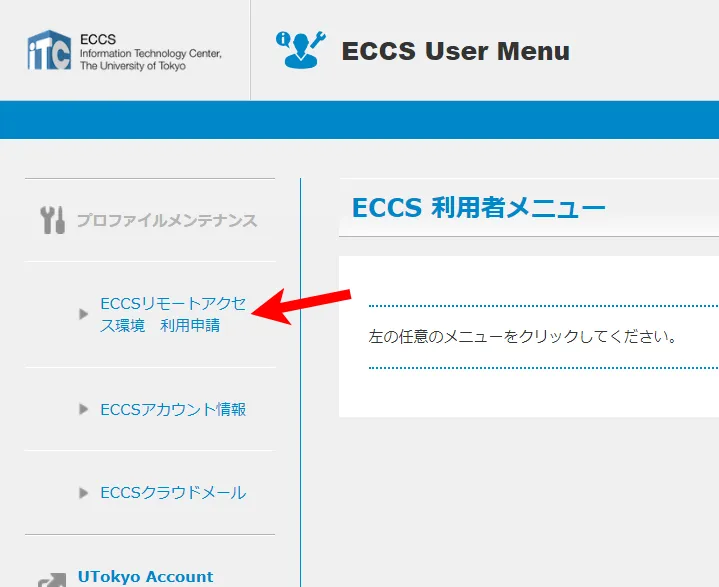 左側のメニューから,「ECCSリモートアクセス環境 利用申請」を選択してください.