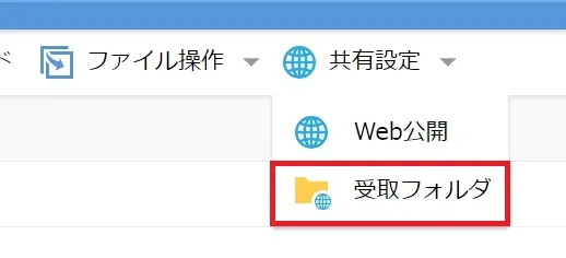 - 一覧の上部に表示されている「共有設定」を選択して「受取フォルダ」を押してください.画面サイズによってはアイコンのみが表示されます.