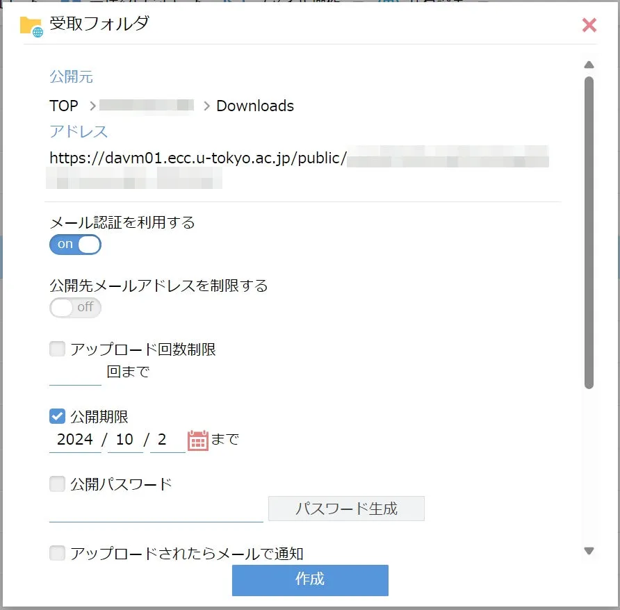 - 設定画面が表示されるので,メール認証や公開期限等を設定してください.表示されているリンクをコピーし「作成」を押してください.