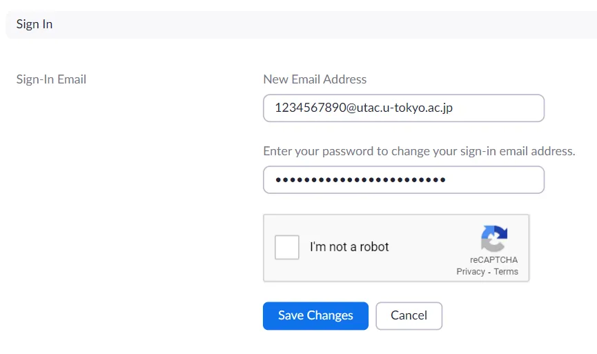 If you see the message "The email address "1234567890@utac.u-tokyo.ac.jp" is already in use" An account using 1234567890@utac.u-tokyo.ac.jp already exists. This account needs to be deleted. Please fill out and submit the Zoom Account Delete Request Form. After you receive an email confirming that deletion is completed, restart from step 1 to change your sign-in email address.