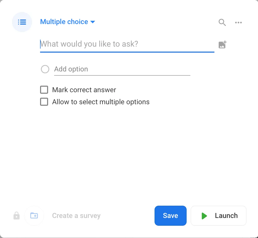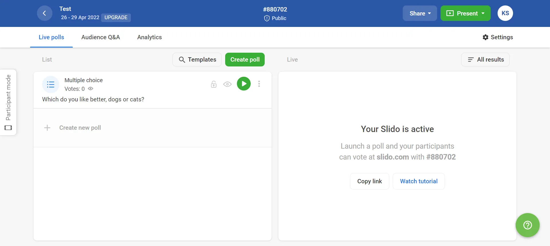 In Slido, the polls feature allows teachers to ask questions/quizzes to students. Select “Live polls” in the upper left corner of the screen.