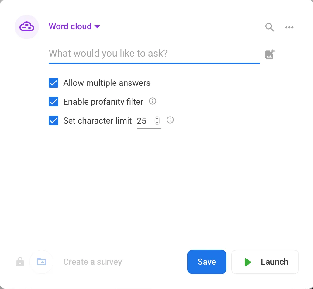 . - Word cloud - Answers to questions are visualized as a “cloud” (participants answer in a short text form same as in Open text)