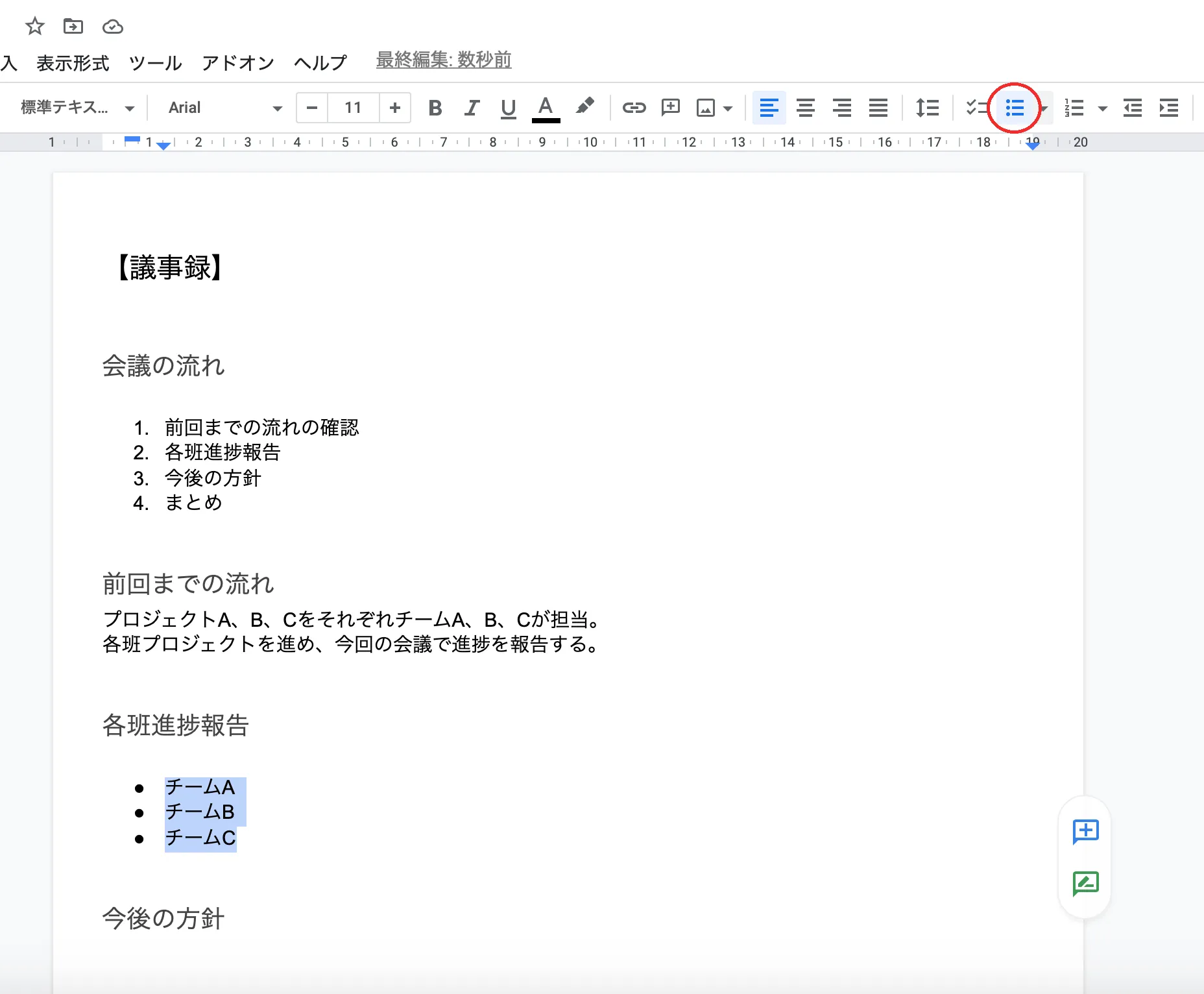 箇条書きにしたい箇所を選択し,ツールバーにある「箇条書き」を選択してください.