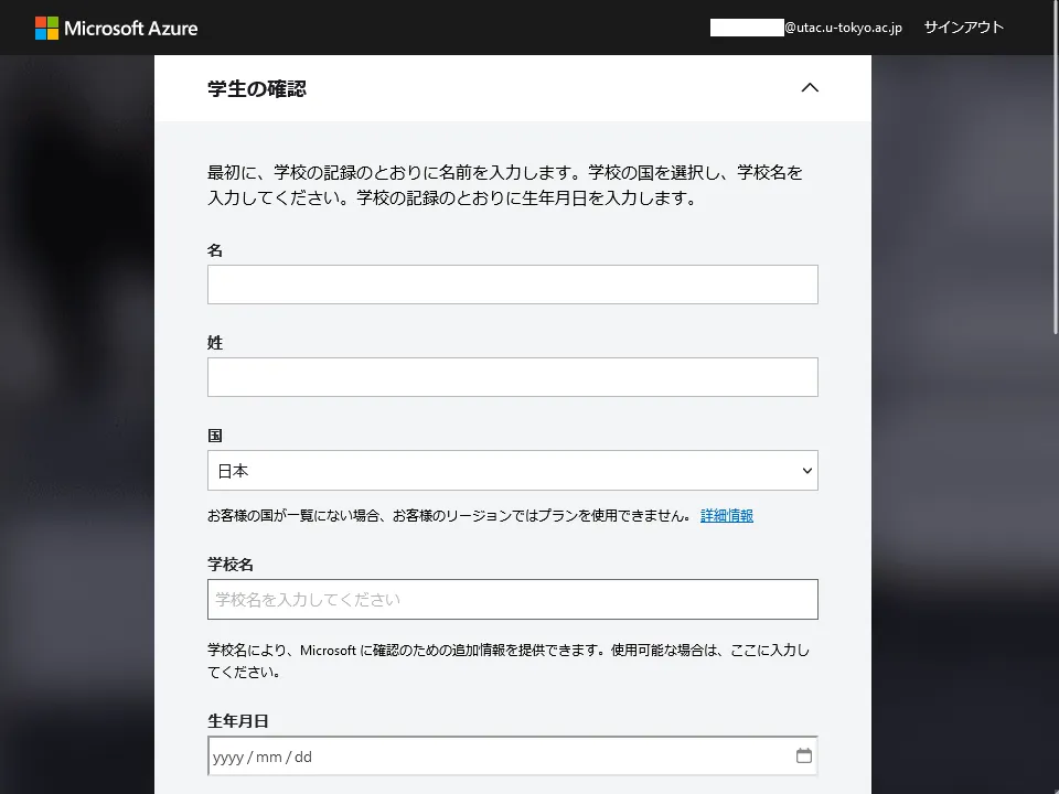 • 2023年6月より,Azure Dev Tools for TeachingをUTokyo Accountで利用できるようになりました.以前案内していた手順である,ECCSクラウドメール (@g.ecc.u-tokyo.ac.jp) のメールアドレスでのアカウント作成は,不要となっています.今後はUTokyo Accountで利用してください.