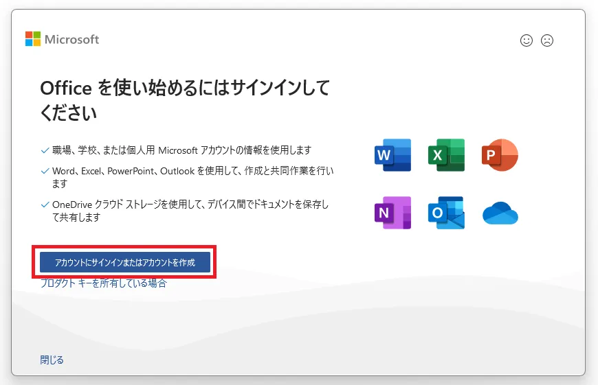 OfficeアプリにどのMicrosoftアカウントでもサインインしていない状態です.「アカウントにサインインまたはアカウントを作成」をクリックしてください. -