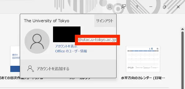 OfficeアプリになんらかのMicrosoftアカウントでサインインしている状態です.右上の人型のアイコンをクリックした後,現在サインインしているアカウントを確認してください.UTokyo Accountでない別のアカウントでサインインしていた場合は「アカウントを追加する」を選択してください.