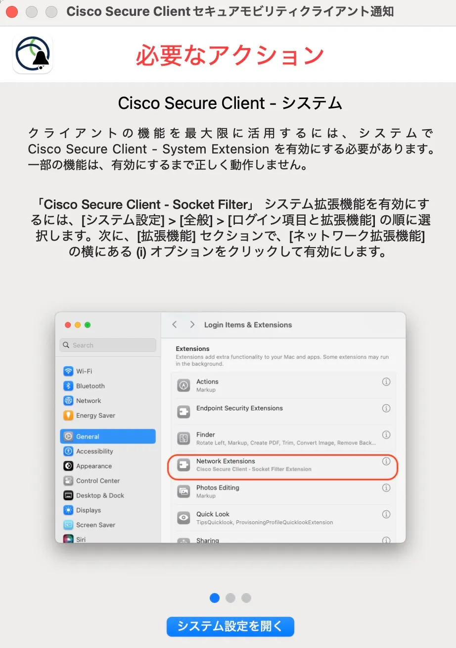 手順D: しばらく待つと,以下のような「必要なアクション Cisco Secure Client - システム」というポップアップが表示されることがあります.その際は表示される手順にしたがって,「システム設定」→「一般」→「ログイン項目と機能拡張」にすすみ,「機能拡張」の「カテゴリ別」を選択し,「ネットワーク機能拡張」の右にある「🛈️」ボタンをクリックし,表示された項目のうち「Cisco Secure Client - Socket Filter」を有効にしてください.この際,以下のような「“Cisco Secure Client - Socket Filter”がネットワークコンテンツのフィルタリングを求めています」というポップアップが表示されたら,「許可」をクリックしてください.