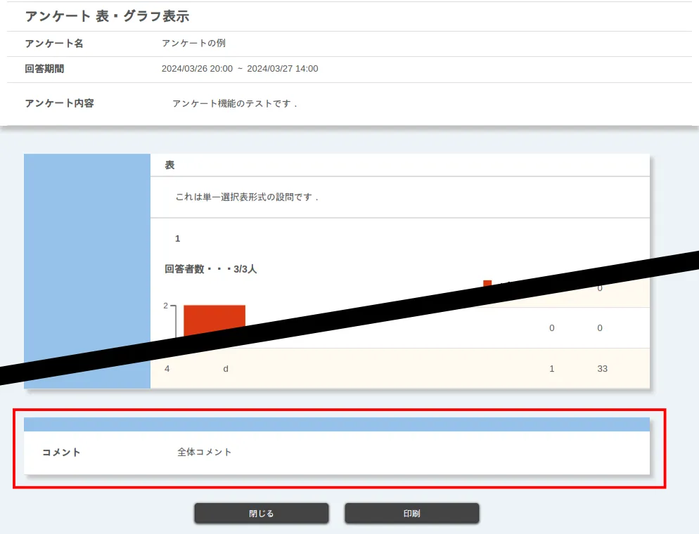 なお,デフォルトでは「アンケート結果公開」設定が「非公開」となっており,履修者に集計結果を公開しない設定になっています.この状態では履修者が「表・グラフ」を開くことができず,コメントをつけても履修者から見えないので注意してください.「アンケート結果公開」の設定については,「アンケートを作成・編集する > アンケート全体の設定」を参照してください.