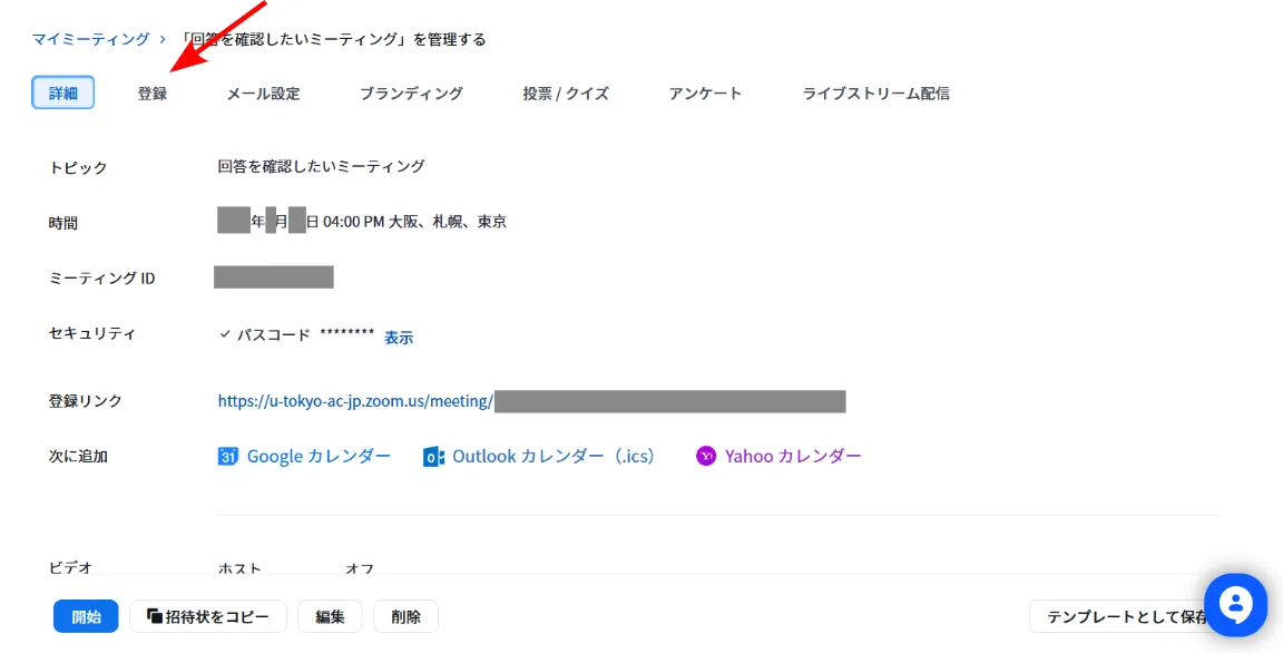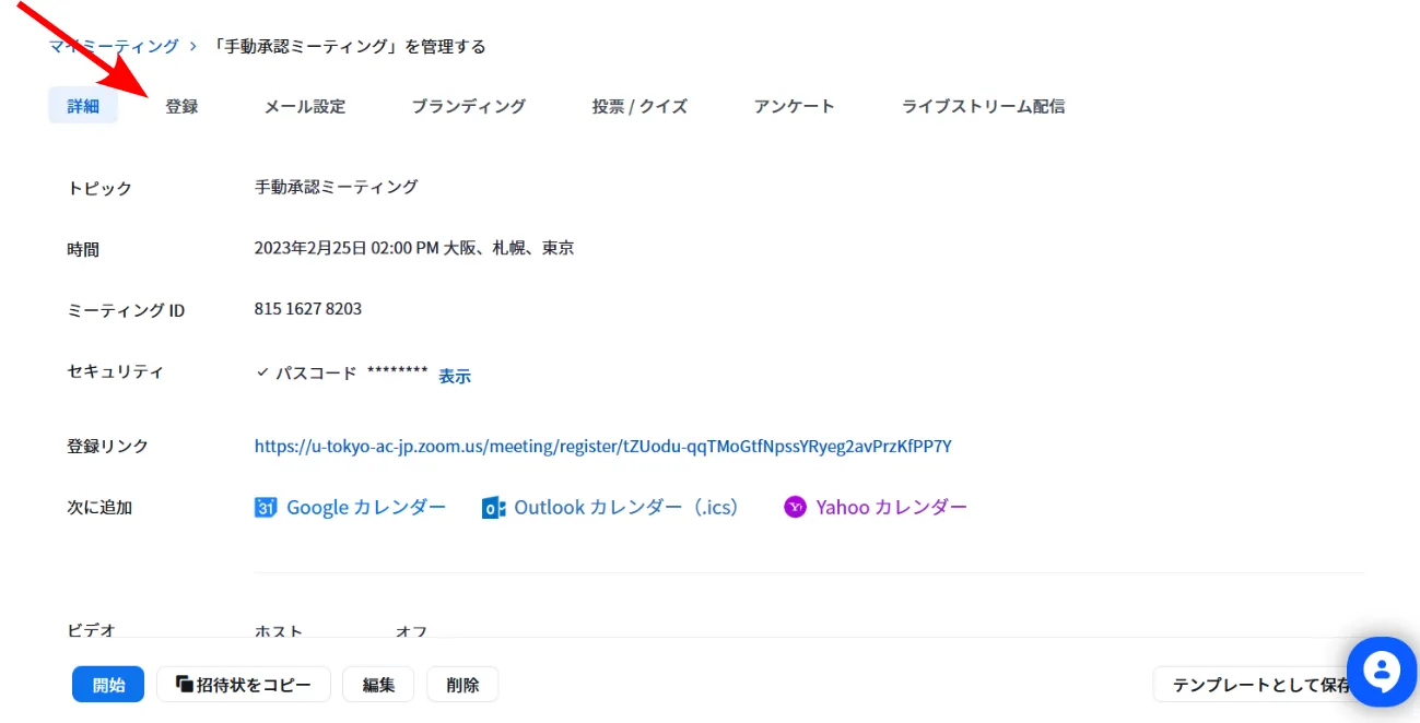 ミーティングの情報が表示されます.上の方に「登録」「メール設定」等のタブが並んでいます.「登録」タブを選択してください.