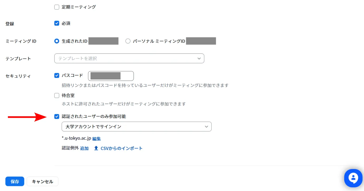 ここでは,事前登録を学内向けに制限できる「参加時に認証を求める」オプションについて説明します.