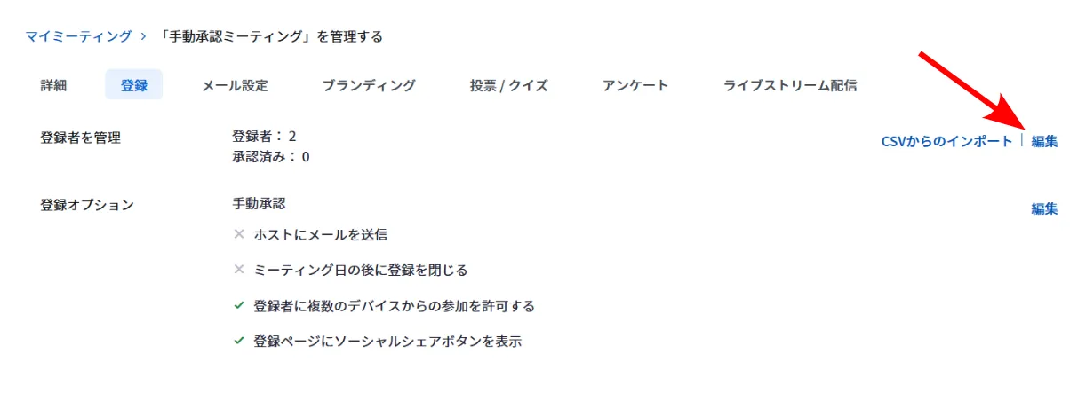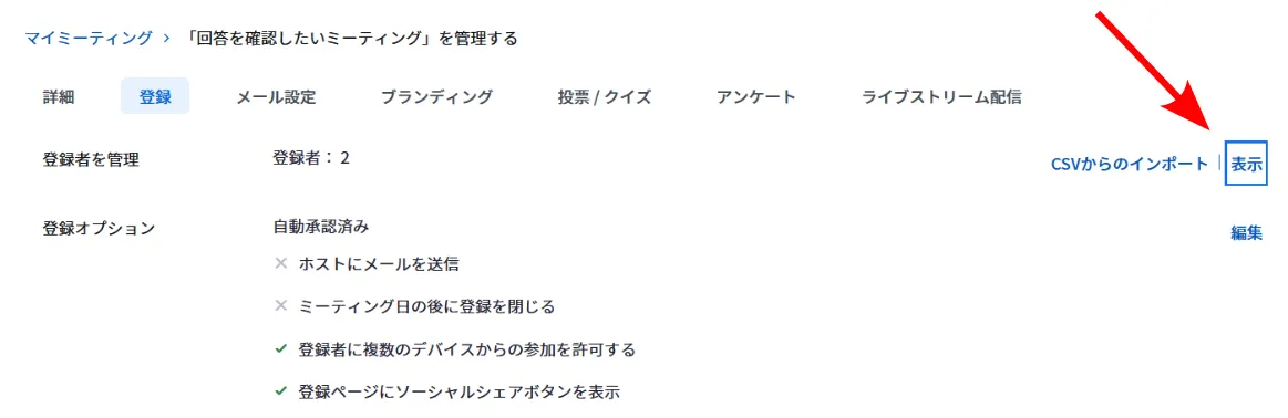 - 「登録者を管理」欄の右側にある「表示」(手動承認を有効にしている場合は「編集」)ボタンを押してください.
