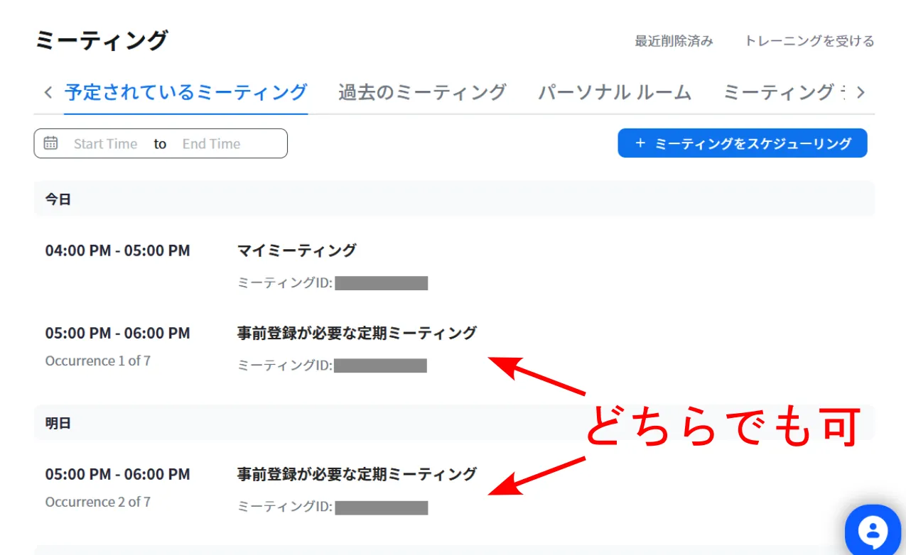 - 自分のスケジュールしたミーティングが,リストとして表示されます.事前登録機能を有効にしたい定期ミーティングの名前を押してください.どの回の項目を押しても構いません.