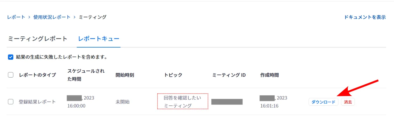 集計結果を見たいミーティングを探し,右側にある「ダウンロード」ボタンを押してください.