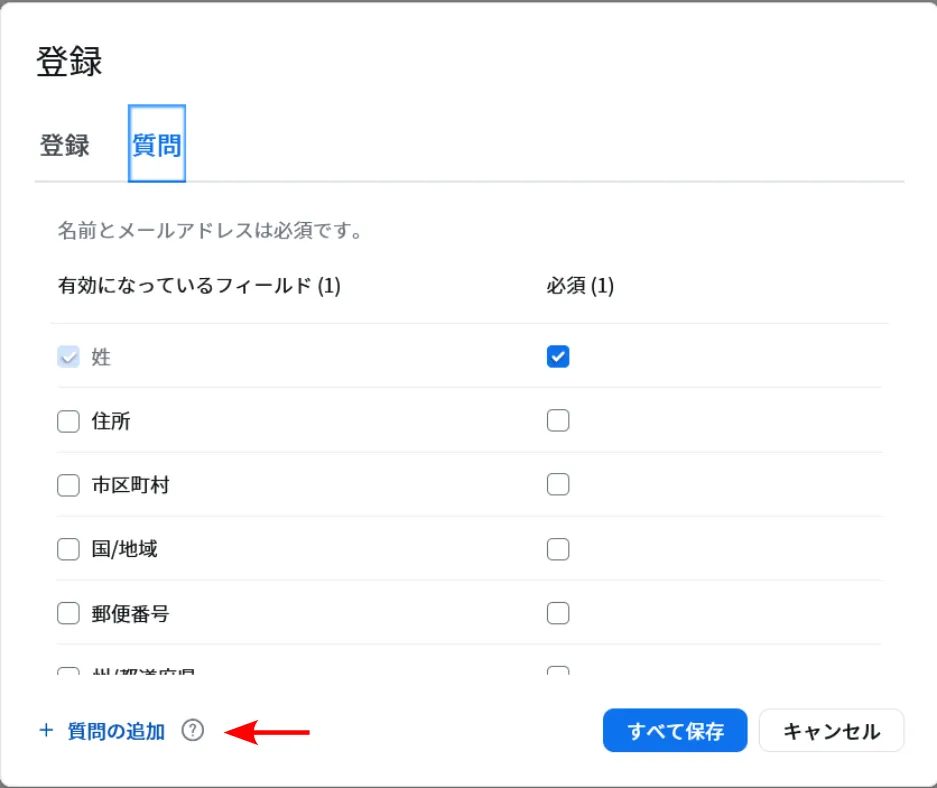 - 追加可能な質問(「国/地域」,「会社名/学校名」など)が一覧で表示されます.