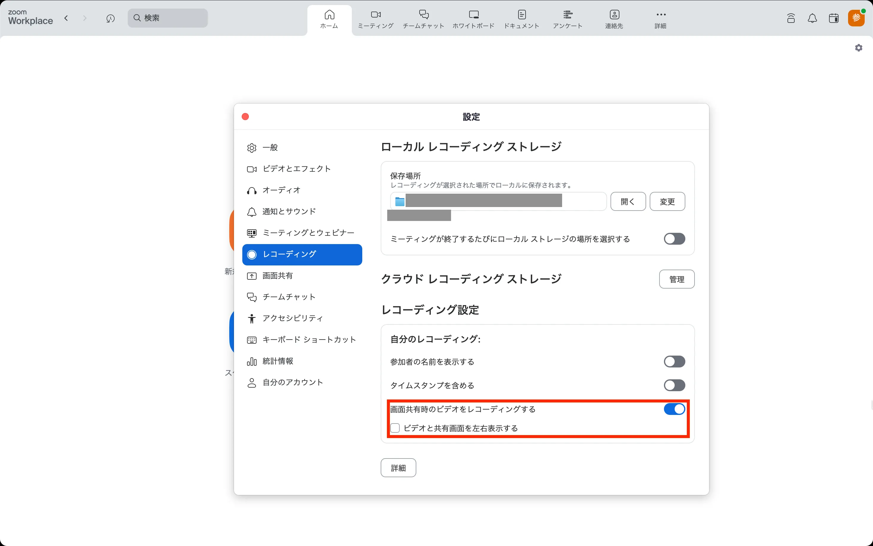 3. 「画面共有時のビデオをレコーディングする」を有効にしてください.